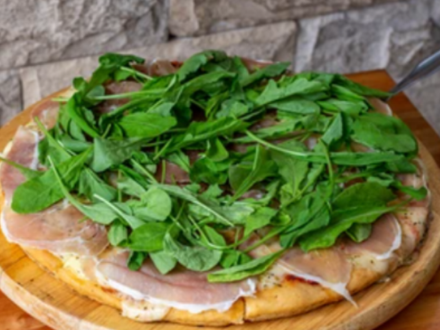 Salsa de tomate, mozzarella, jamón crudo, rúcula fresca, aceitunas