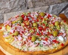 Salsa de tomate, mozzarella, jamón, morrón en tiras, aceitunas
