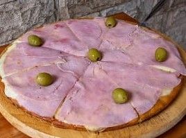 Salsa de tomate, mozzarella, jamón, tomate natural, orégano, aceitunas verdes