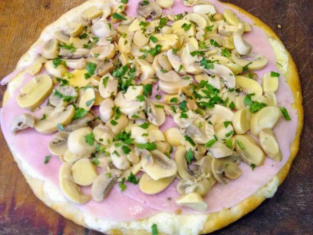 Mozzarella, jamón, champignones, ajo, orégano, perejil, aceitunas verdes