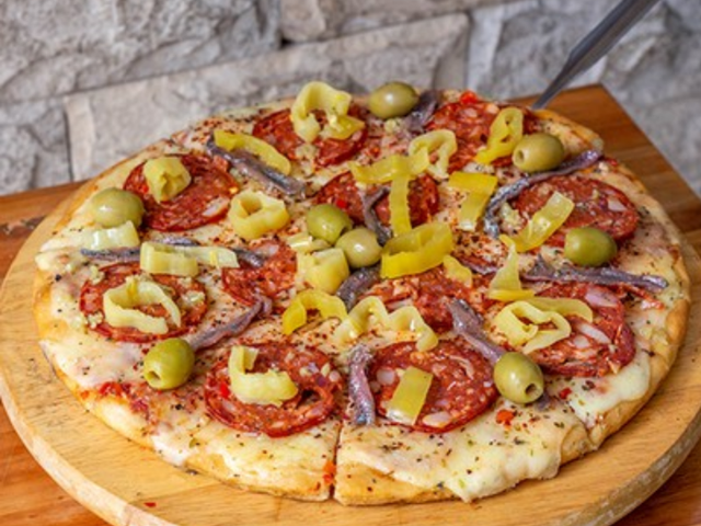 Salsa de tomate, mozzarella, ají molido, cantimpalo, anchoas, ajís en vinagre, ajo, orégano, aceitunas verdes