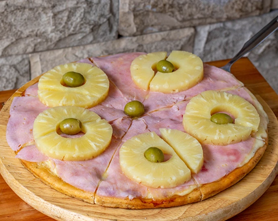 Salsa de tomate, mozzarella, jamón, ananá en rodajas, aceitunas