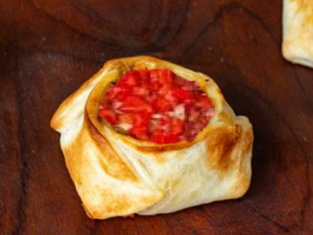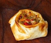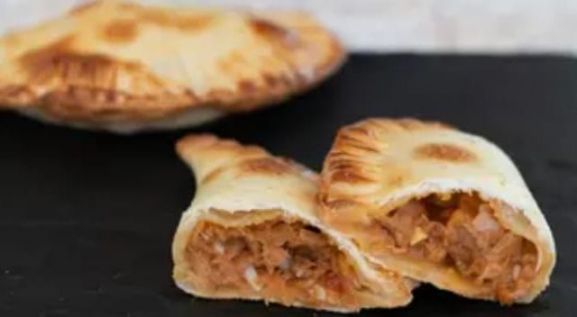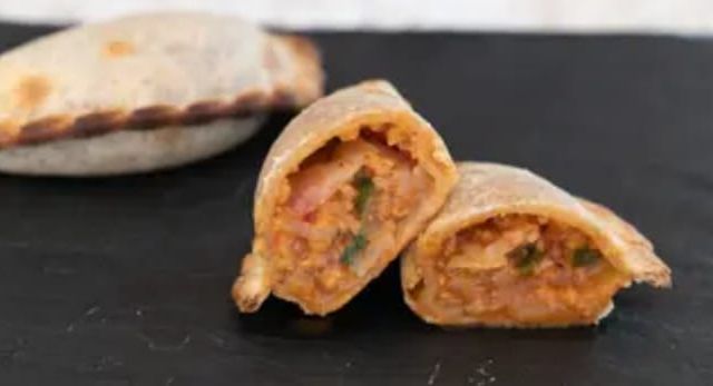Empanada tapa de masa integral, soja texturizada sabor carne, cebolla, cebolla de verdeo, morrón, aceitunas verdes.