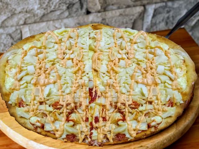 Salsa de tomate, mozzarella, palmitos, salsa golf, aceitunas verdes