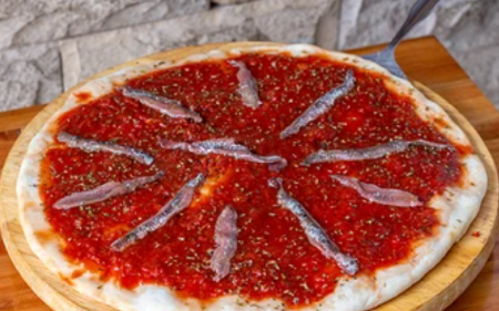 Salsa de tomate, anchoas, orégano, aceitunas verdes