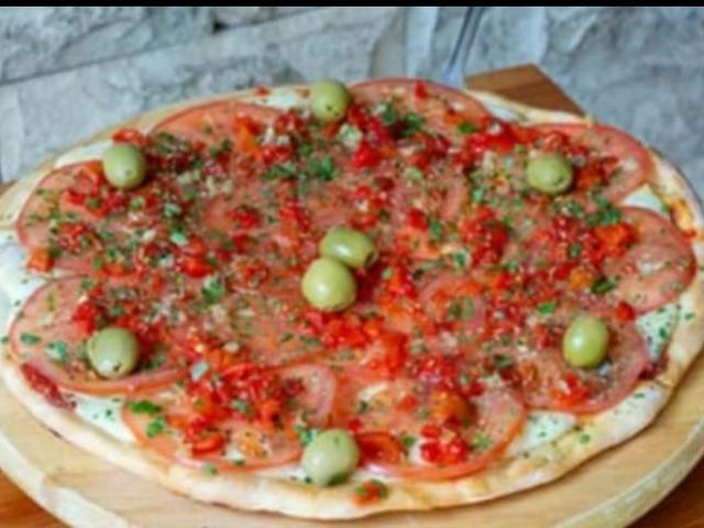 Salsa de tomate, mozzarella, rodajas de tomate, albahaca fresca, aceitunas verdes