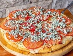 Salsa de tomate, mozzarella, rodajas de tomate, roquefort, orégano, aceitunas verdes