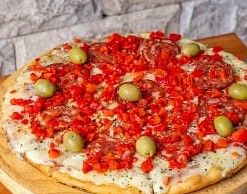 Salsa de tomate, mozzarella, cantimpalo, morrón picado, orégano, aceitunas verdes